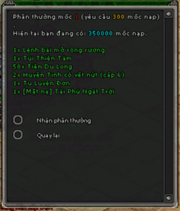 | 16000 điểm | 3 Huyền tinh cấp 8 (khóa) 1000 tiền du long 1 Bổ tu lệnh 5 Thỏi bạc Bang hội (tiểu) 1 Lệnh bài Chúc phúc (cao) 1 Mã bài Ức Vân Danh hiệu nhà tài trợ Vàng |